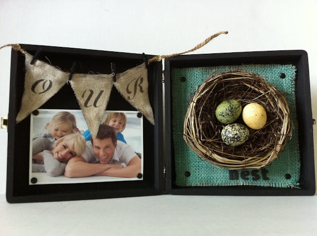 After the burlap dried I added 4 black brads to each corner and glue it into the box using E6000 glue. I used Thickers stickers to spell out "nest" and glued my nest in with E6000.